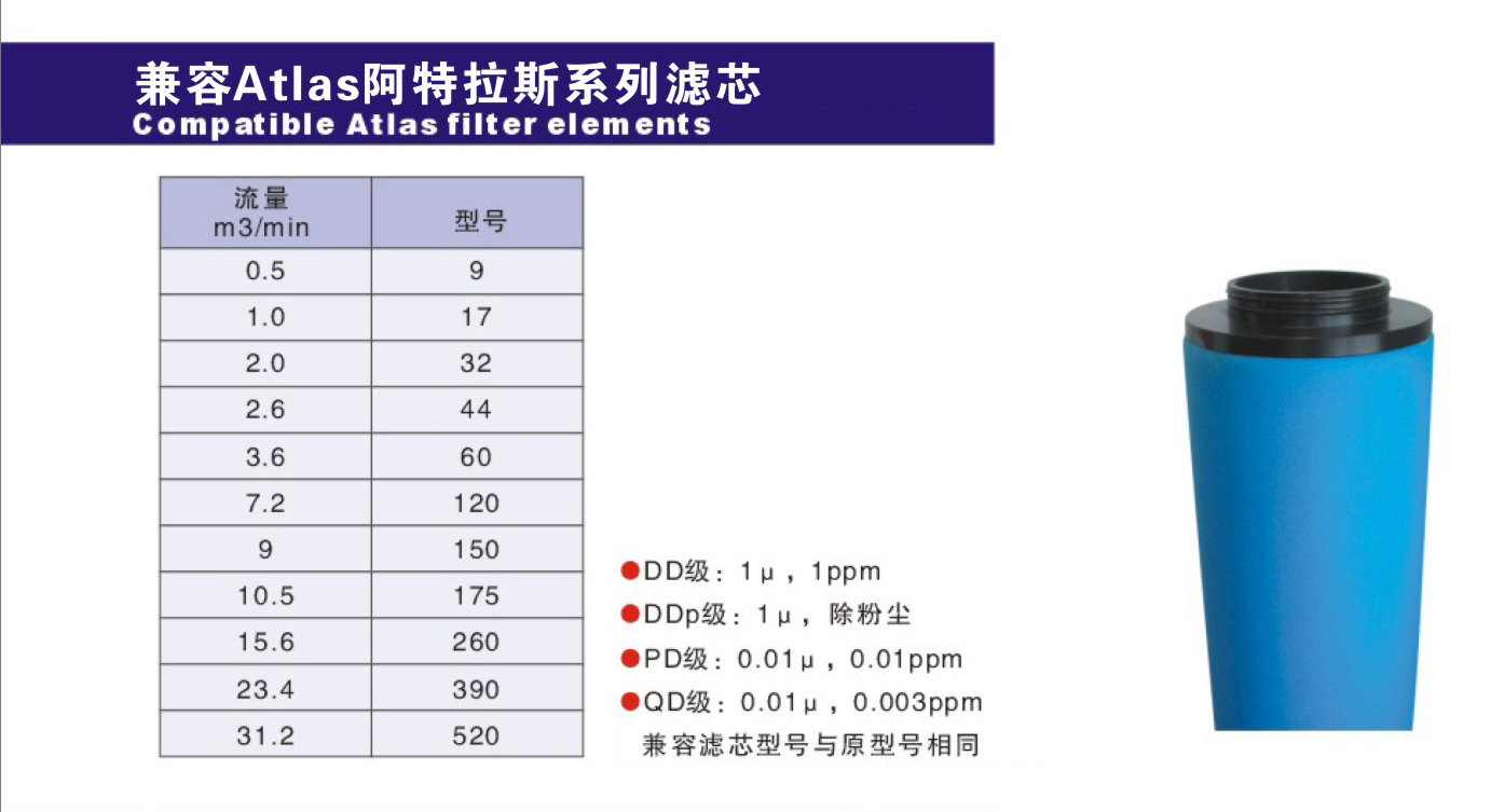 兼容阿特拉斯精密濾芯標準型號: