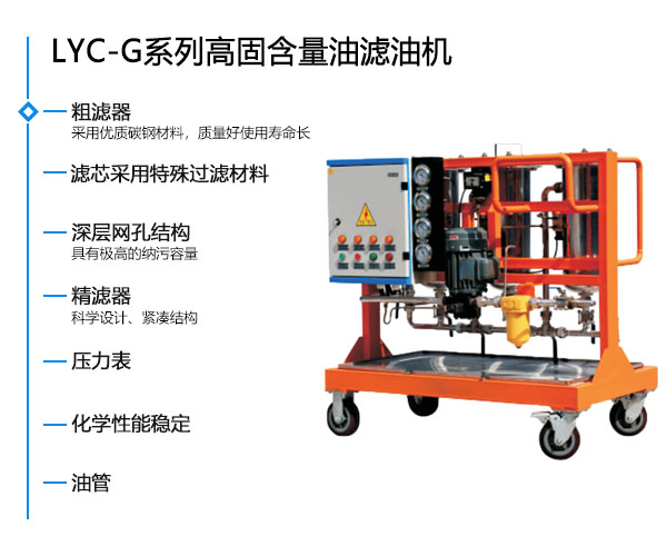 LYC-100G高固體含量濾油機特別適應于高固體含量的場合。尤其適合廢油再生及食品油的澄清過濾。
