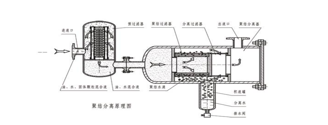 聚結(jié)脫水濾油機(jī)不同的液體有著不同的表面張力,而液體流過(guò)小孔時(shí),表面張力越小,所通過(guò)的速率就越快,當(dāng)不同的混合液體流入分離器后,首先進(jìn)入聚結(jié)濾芯,聚結(jié)濾芯具有多層過(guò)濾介質(zhì),其孔徑逐層遞增。由于表面張力的差異,油液快速通過(guò)濾層,而水卻緩慢的多;又由于聚結(jié)濾芯采用親水性材料,微小的水滴更是吸附在濾層表面從而造成水滴的聚結(jié)。受動(dòng)能的作用,小液滴競(jìng)相通過(guò)開(kāi)孔,逐漸匯成大的液滴,并在重力作用下沉降而與油液分離,通過(guò)聚結(jié)濾芯后的油液,仍有尺寸較小的水珠在慣性作用下向前至分離濾芯處。聚結(jié)脫水濾油機(jī)的分離濾芯由特殊的疏水材料制成,在油液通過(guò)分離濾芯時(shí),水珠被擋在分離濾芯的外面,而油液則通過(guò)分離濾芯,并從出口排出。