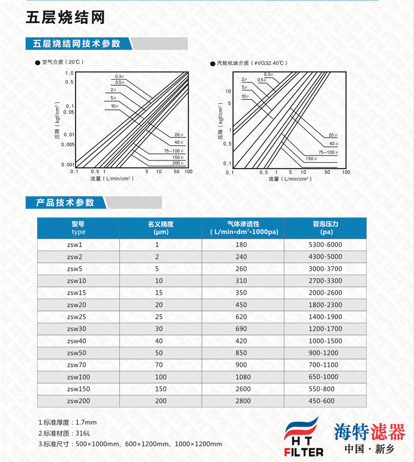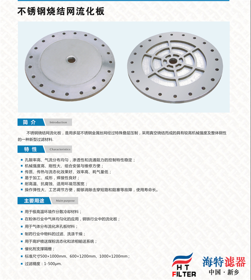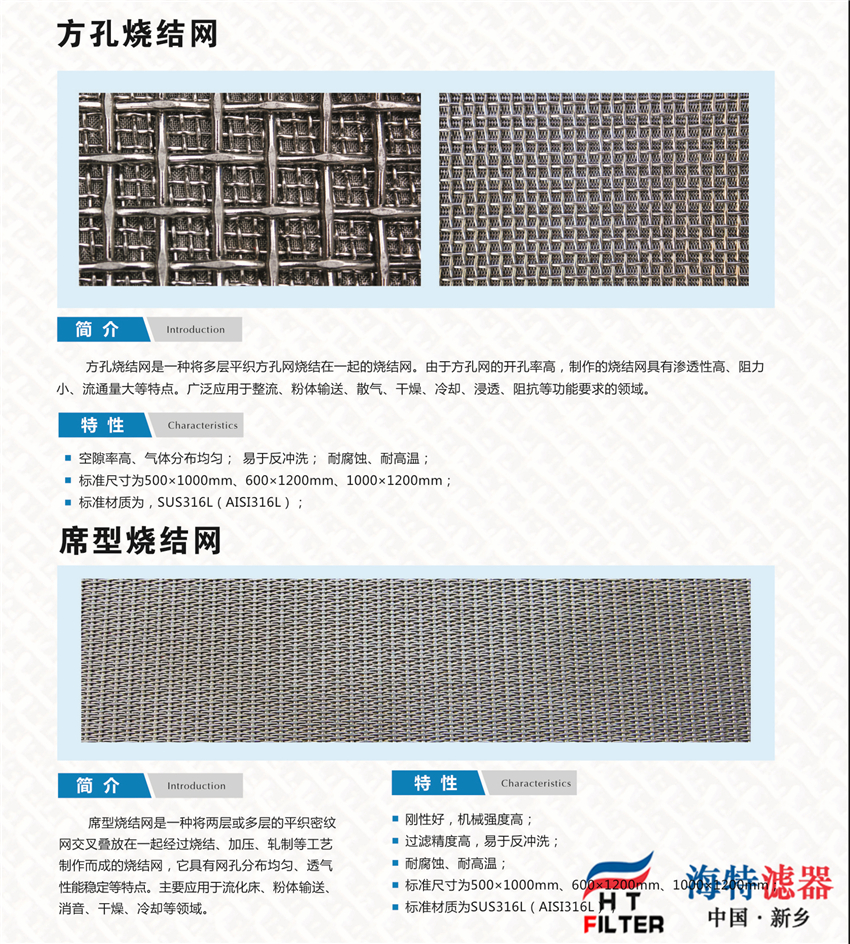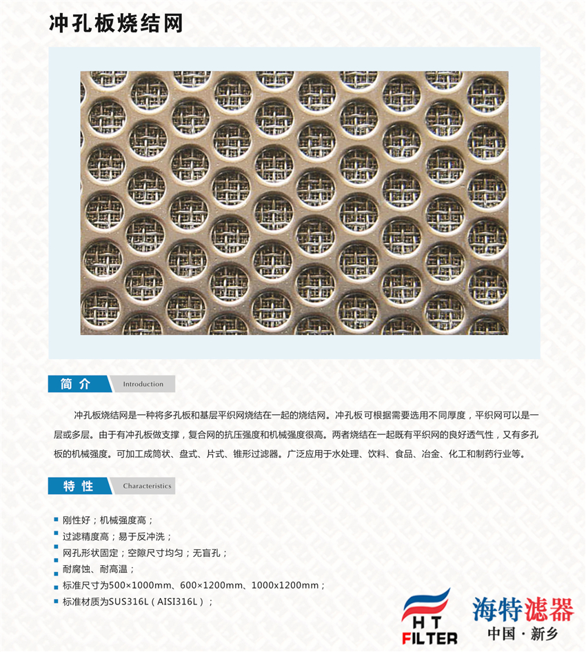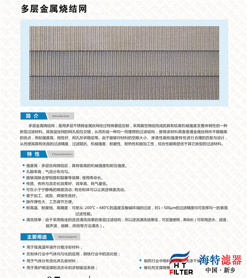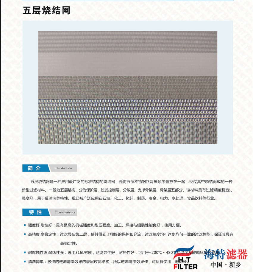 1. 過濾精度穩定:由于有上下兩層絲網做保護,加之擴散固溶的燒結工藝其過濾網孔不易變形。2. 強度好:由于有第四、第五層做支撐,固有很高的耐壓性和機械強度。3. 易清洗:由于采用表面過濾材料,具有容易清洗的特點,特別適用于反沖洗。4. 易加工:適合裁剪、折彎、沖壓、拉伸、焊接等加工工藝。5. 耐高溫:可承受480℃的高溫。6. 耐腐蝕;由于采用316L或304材料,故耐腐蝕性強。