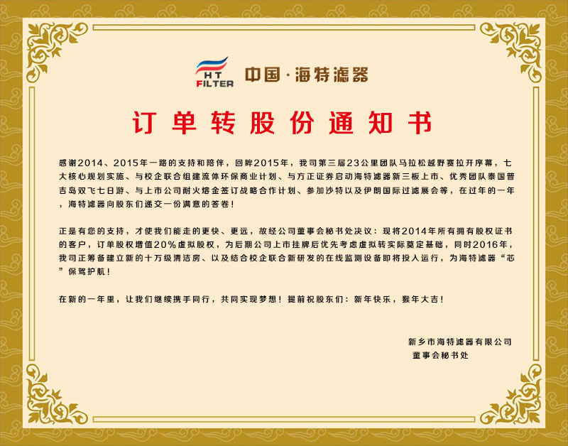 正是有您的支持,才使我們能走的更快、更遠(yuǎn),故經(jīng)公司董事會(huì)秘書(shū)處決議:現(xiàn)將2014年所有擁有股權(quán)證書(shū)的客戶(hù),訂單股權(quán)增值20%虛擬股權(quán),為后期公司上市掛牌后優(yōu)先考慮虛擬轉(zhuǎn)實(shí)際奠定基礎(chǔ),同時(shí)2016年,我司正籌備建立新的十萬(wàn)級(jí)清潔房、以及結(jié)合校企聯(lián)合新研發(fā)的在線監(jiān)測(cè)設(shè)備即將投入運(yùn)行,為海特濾器“芯”保駕護(hù)航!