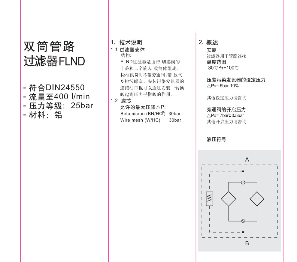 FLND雙筒低壓管路過濾器|國產替代賀德克由上蓋和筒體組成的整體式過濾器,帶有球式切換和可接污染發訊器的接口,安裝在管路過濾器中, 用來濾除液壓液壓系統中各元件由于磨損產生的金屬粉末以及密封件的橡膠雜質,使流回油箱的油液保持清潔,以利于系統中的油液循環使用。