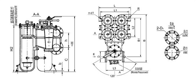 該雙筒過濾器在裝換閥體腔外側有兩對進出油口,油系下進上出,由管螺紋接頭或方法蘭與外部油管連接,兩濾芯腔底各有一個裝螺栓的排污孔,供排放污油。為固定濾器,殼體上有到螺栓孔的法蘭,供安裝使用。